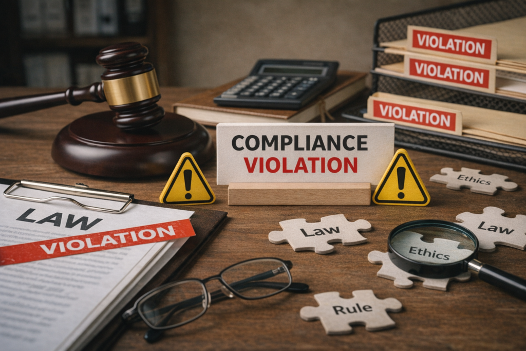 コンプライアンス違反とは、法令や社内規定、倫理基準に反する行為を指します。具体的には以下のような行為が含まれます。