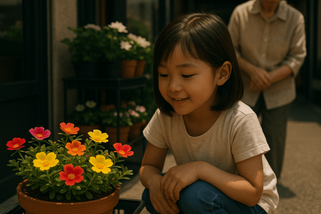 小学二年生の結衣が、祖母の花屋でしゃがみ込み、鉢植えのポーチュラカを覗き込む。